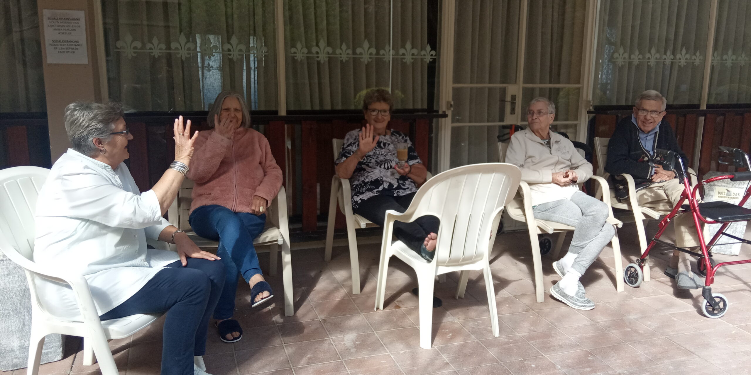 Today was a marvelous day. The birds were tweeting and chirping like a mass choir! The warm air was inviting – and the elderly responded… As I walked past the terrace in our quad area, I saw the normal row of chairs, but this time with bums in the seats! It was like our residents came down to watch the nature show in our quad garden! My heart was so happy to see so many of the elderly downstairs and outside.